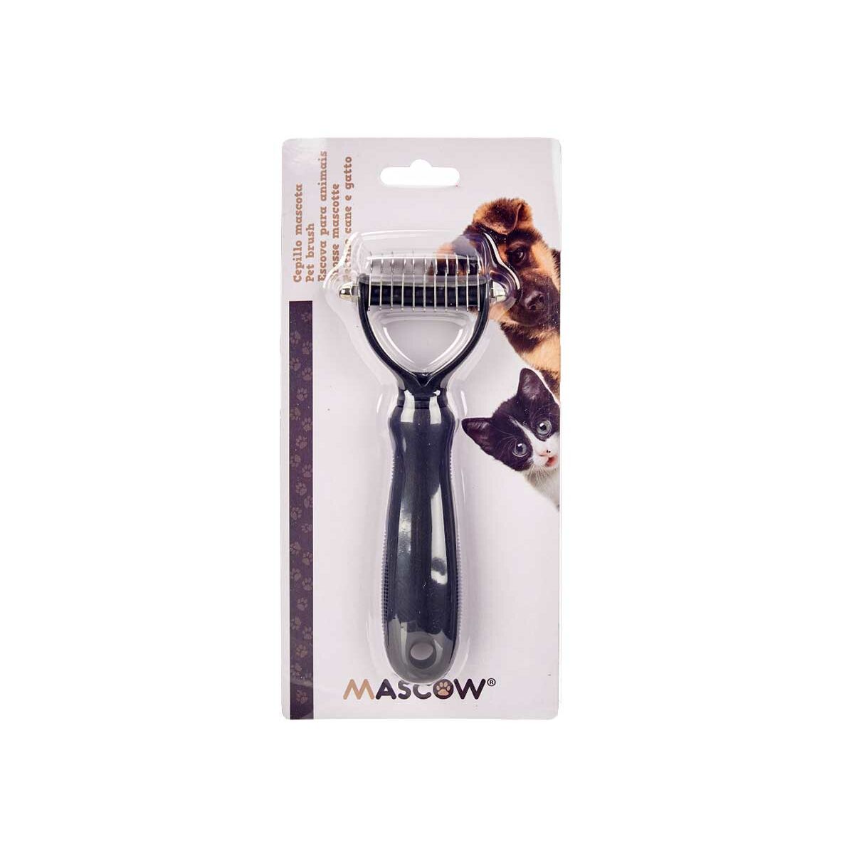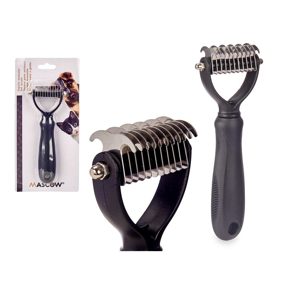 El rastrillo para perros de la marca Mascow es un cepillo para perros diseñado especialmente para el cuidado del pelaje canino, ideal para eliminar el pelo muerto y reducir el enredo con eficacia. Este cepillo cuenta con un mango ergonómico de silicona que proporciona un agarre cómodo y antideslizante durante el cepillado, facilitando el manejo incluso en sesiones prolongadas. Su estructura incorpora cuchillas metálicas finas colocadas para alcanzar delicadamente las capas más profundas del pelaje sin causar irritación en la piel, lo que ayuda a mantener el pelaje limpio, suave y saludable. Además, el color negro le proporciona un acabado elegante y resistente al desgaste, adecuado para su uso frecuente. Este rastrillo es apto para distintos tipos de perros y resulta especialmente útil para mascotas que mudan pelo regularmente, ayudando a minimizar la acumulación de pelo en el hogar y favoreciendo la circulación sanguínea en la piel del animal durante el cepillado. Su diseño compacto y funcional lo convierte en una herramienta práctica tanto para uso doméstico como para profesionales del cuidado animal. En resumen, el cepillo cuchillas Mascota con mango de silicona de Mascow es una opción eficiente y cómoda para mantener el pelaje de los perros cuidado y libre de nudos.